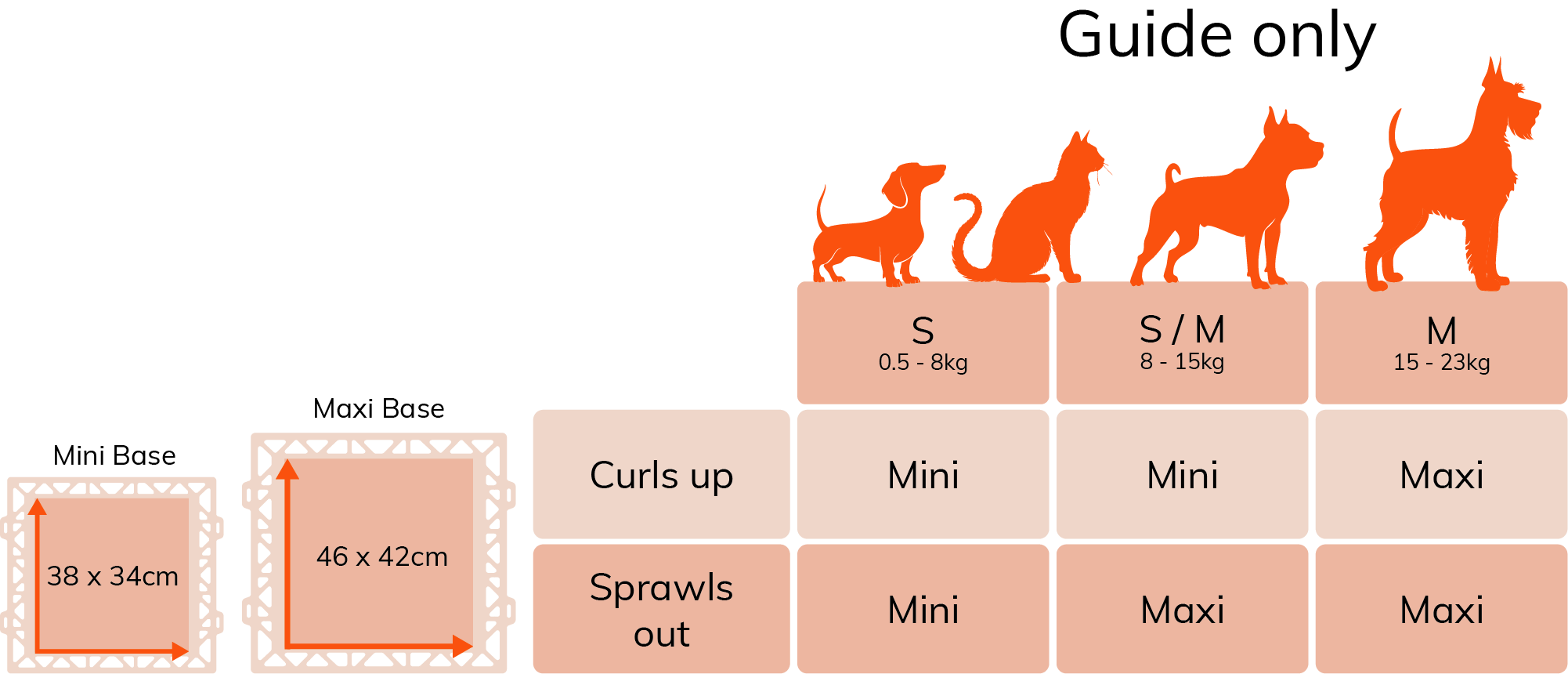 Note the bed bases are interchangeable. This is for you to choose based on your pets preference. We recommend pets lighter than 5kgs to try the fabric base. For pets up to 15kgs, we recommend the wooden base. Please visit our assembly guide page for more information.